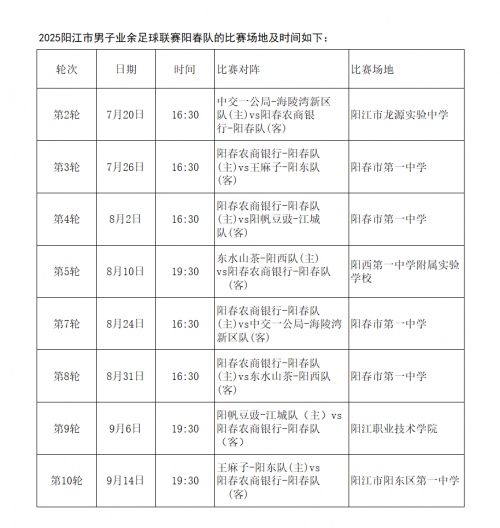 信息拓展:“体育助力百县千镇万村高质地发展工程——2025阳江市须眉业余足球联赛”阳春队赛程公布,阳春球迷快来望望吧!安排好时代为阳春队加油恭维。